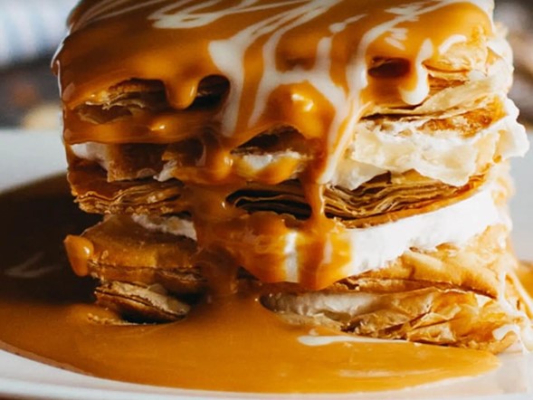 Las milhojas, que significan “mil hojas”, son postres hechos con capas apiladas de hojaldre, rellenos de crema pastelera; nata; dulce de leche; una mezcla cremosa de leche condensada, azúcar y vainilla; o chocolate blanco. Forman parte de las cocinas de España, Colombia y algunos países de América Latina. Podría decirse que este es el mejor postre de la ciudad, siempre recién hecho a pedido.
